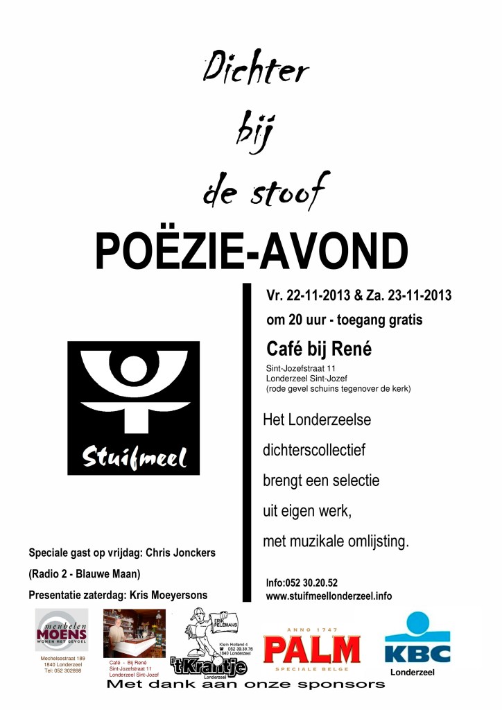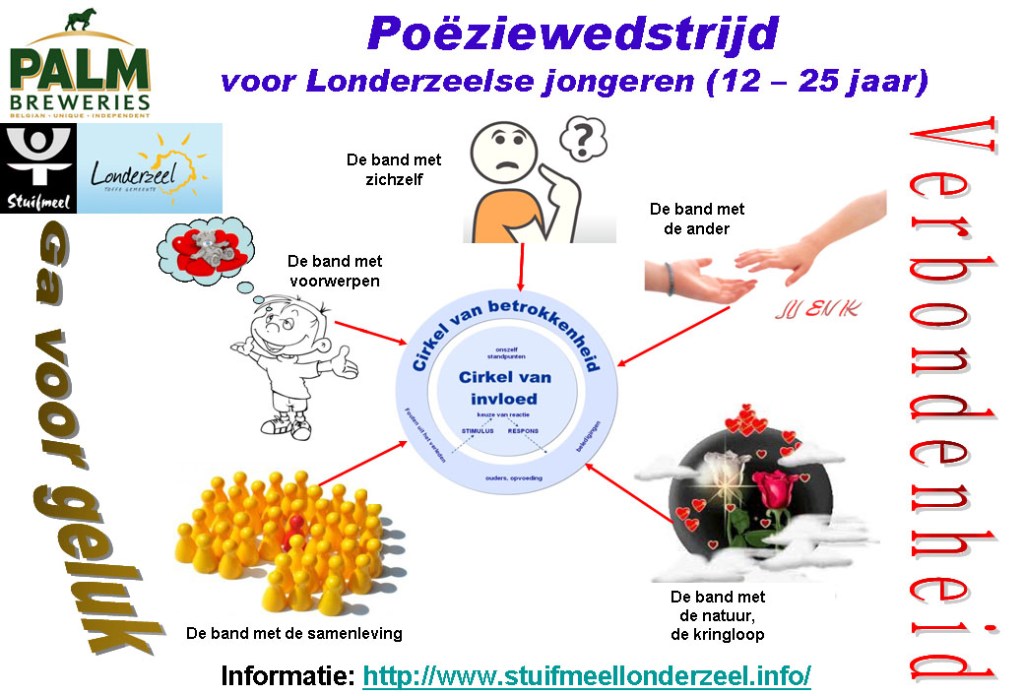 Emotionele expressievaardigheden – met poëzie op de eerste rij – zijn belangrijke preventiemiddelen. Daarom organiseert dichterscollectief Stuifmeel in samenwerking met Jan Toye en zijn Stichting ‘Ga voor Geluk’, een poëziewedstrijd voor Londerzeelse jongeren (12 – 25 jaar) die in groot-Londerzeel wonen, er school lopen of er bij een jeugdbeweging zijn.