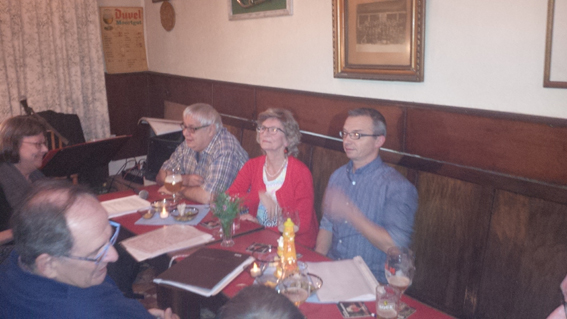 Met een feel-good-thema en een gevarieerd programma kon de avond niet stuk. Nog enthousiaster dan anders probeerde de competente dirigente Eva Goudie – Falckenbach haar koor in goede muzikale banen te leiden. En… het lukte haar. Alleen de bassen ‘basten’ soms wat achterop. Onze poëzie zorgde voor rustpunten en humoristische ontspanningsmomenten en onze dichters hielden zich aan de hun opgelegde thema’s. Waar hadden ze dat geleerd? Alleen met de dresscode hadden sommigen het wat moeilijk en Wim zocht een ietsje té lang naar zijn laatste – nachtgedicht. Maar… als je hem hoorde gitaar spelen, gaf je hem de absolutie zonder biechten, ook al is die kerkelijke uitdrukking aan hem niet besteed. Jesmina beleefde haar première in een ietwat – trillende – roes en tot haar grote verbazing wilden twee toekomstige trouwers haar liefdesgedichtjes lenen voor hun huwelijksviering. En… Kris Moeyersons praatte het allemaal aan mekaar alsof hij nooit wat anders had gedaan.