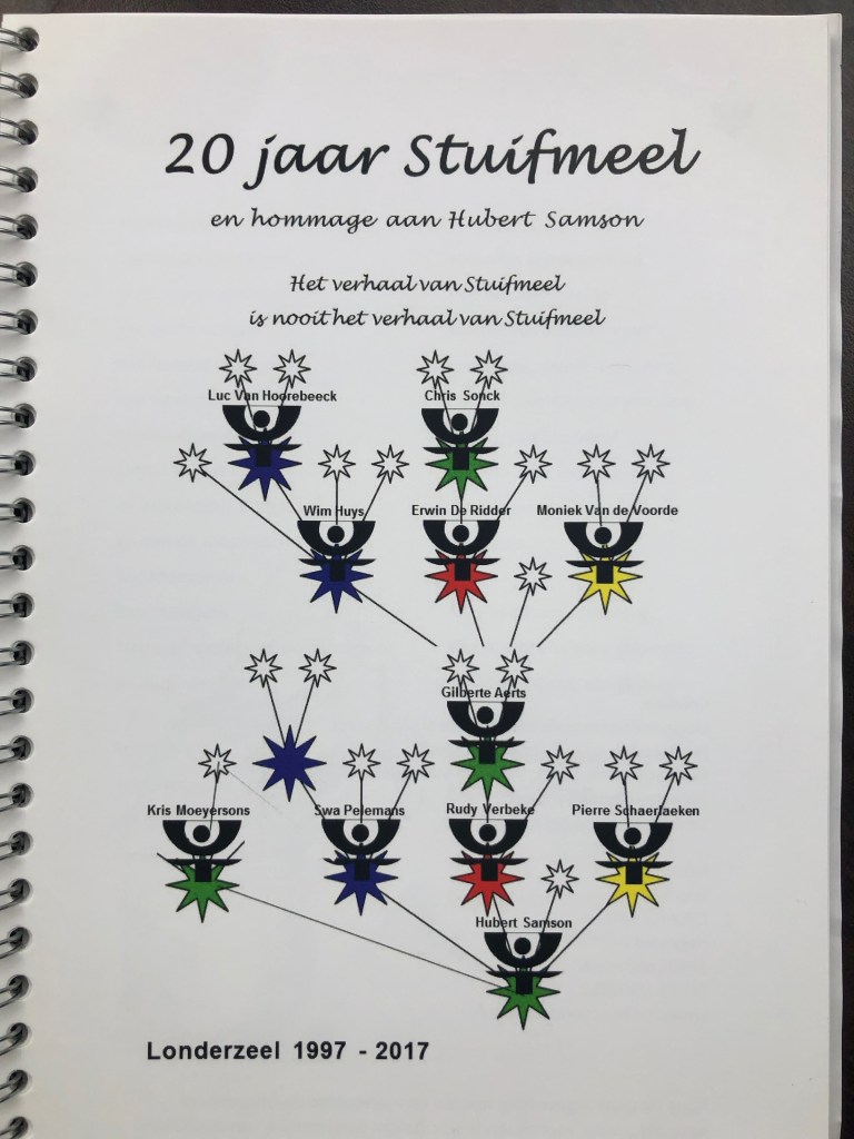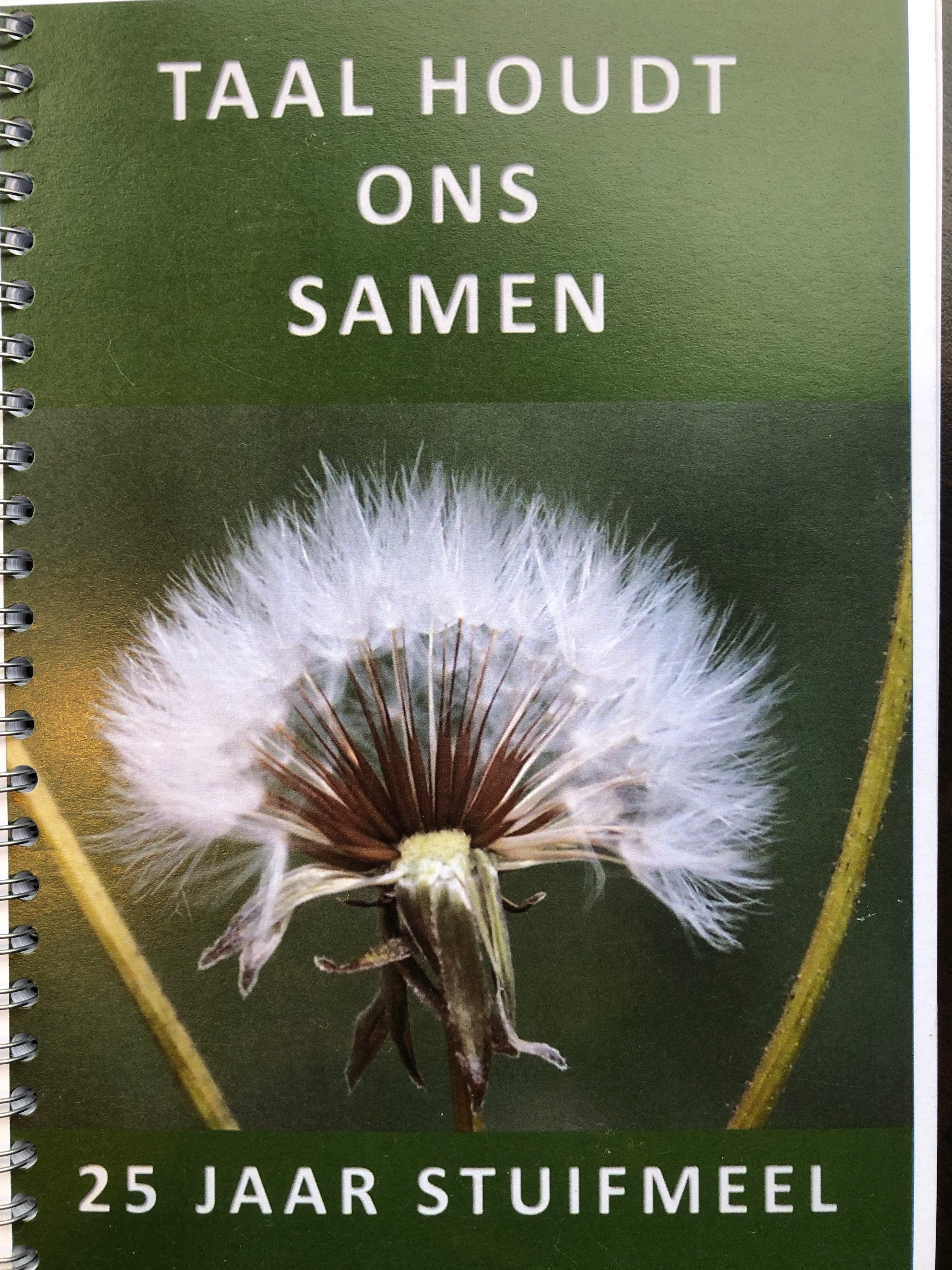 Nadat ze hun jongensdroom van piloot, brandweerman of troubadour aan de haak hadden gehangen, werden vijf mannen – los van elke zekerheid – dichter. Dat was een goedkoop idee, want met potlood en papier ging je al een heel eind ver. Ze noemden zich ‘Stuifmeel’, want ze waren graag mannelijk en stuifmeelden er maar op los. Alleen stampers werden geweerd als kiespijn. In hun poëzie zwegen ze heel wat dood en brachten nog meer tot leven, want poëzie is schrappen. Met shows, geïllustreerde dichtbundels en poëziewedstrijden bewogen ze zich ‘extra muros’. Ze overgoten hun zomerzotheid met een paar duvels en zochten naar vormen voor hun niet -te- bestuiven passies. Op dat moment had er waarschijnlijk maar één het laatst woord, want er werd een voorzichtig stampertje op de dichterlijke rooster gelegd. Na een korte tijd noemde de toen al zieke voorzitter haar een vrouw -met- pit. De medestuifmelers hadden iets over gedrevenheid en werken gehoord. Meer was er niet nodig om zelfs als stamper voorzitter te worden.