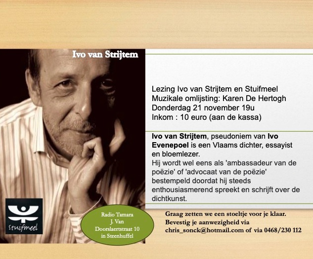 Ivo Van Strijtem nam ons (25 tal aanwezigen) in café Radio Tamara mee op een uniek poëtisch parcours langs moeders en ontroering, een broer, Jezus en citaten die blijven beklijven… De afwezigen hadden ongelijk, wie er was kan nog nagenieten van zijn charisma, het enthousiasmeren en ’t ontroeren .. Karen zorgde voor gepaste accordeonintermezzi. De stuifmelers brachten live of via opname een mooi voorprogramma. Dank aan Ivo, Karen, alle aanwezigen en wie er mee een geslaagde avond van maakte. Het was ‘de vrolijke tijd’ 2.0. !